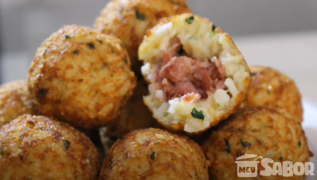 Ingredientes 2 Xícaras de arroz cozidos 2 Ovos 150g de muçarela ralada 1 Gomo de calabresa ralada 3 Colheres (sopa) bem cheias de farinha de