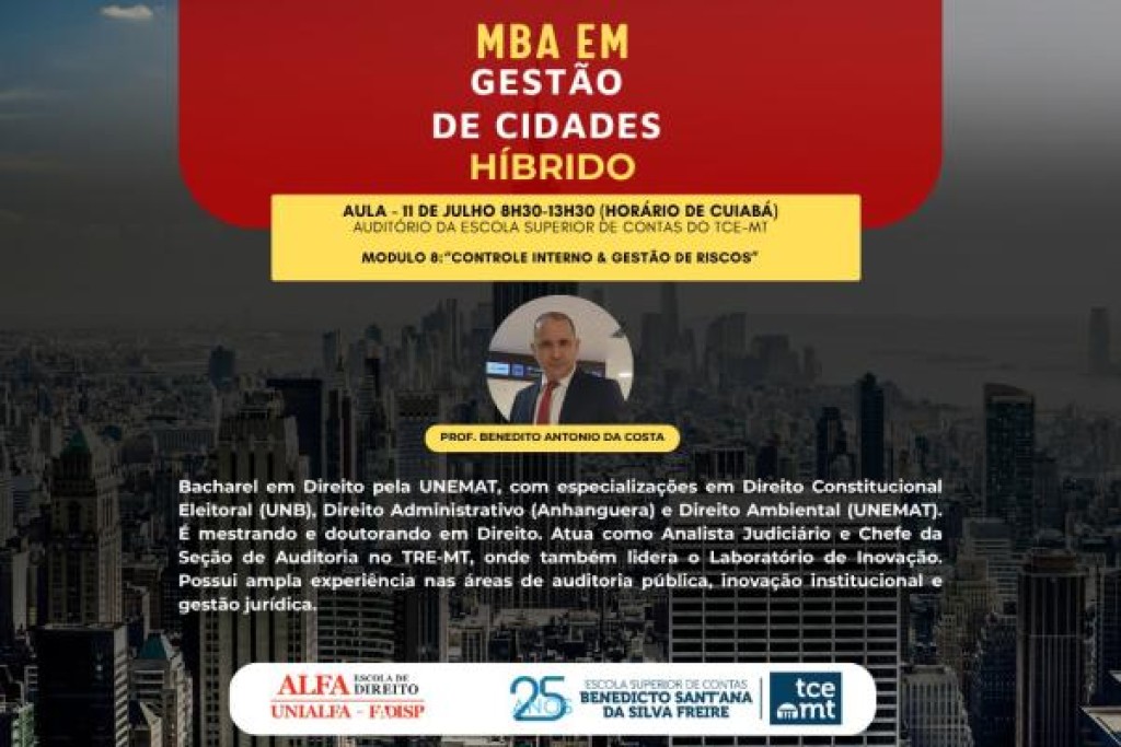 Promovido em parceria com a Faculdade Autônoma de Direito (Fadisp), o MBA em Gestão de Cidades possui carga horária total de 360 horas e reúne cerca de mil alunos, entre prefeitos, vice-prefeitos, vereadores, secretários e técnicos municipais, além de servidores da administração estadual de Mato Grosso com formação superior. Parte da estratégia da atual gestão do TCE-MT, sob presidência do conselheiro Sérgio Ricardo, o MBA busca fortalecer a capacitação contínua de servidores e gestores públicos. A pós-graduação é realizada por meio da Escola Superior de Contas e conta com a coordenação do procurador-geral do Ministério Público de Contas (MPC), Alisson Carvalho de Alencar.
