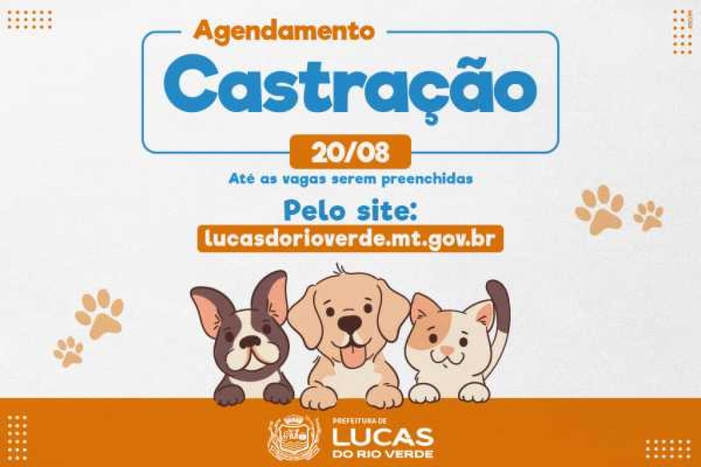 A Prefeitura de Lucas do Rio Verde, por meio da Unidade Permanente de Castração, abre nesta quarta-feira (20), o agendamento para castração gratuita de cães e gatos. A solicitação deve ser feita exclusivamente pelo site oficial da Prefeitura, com vagas limitadas a cada mês.