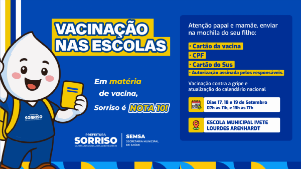 Com o lema “Em matéria de vacina, Sorriso é nota 10!”, a ideia tem percorrido diversas instituições de ensino do município, levando mais saúde e comodidade para perto das famílias, além de reforçar a importância da prevenção como forma de cuidado coletivo.