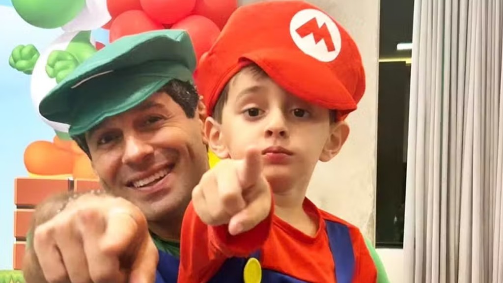 João Baldasserini e a esposa, Érica, comemoraram o aniversário de 5 anos do filho, Heleno, com uma festa temática inspirada nos games de Mario Bros. Para a festa, que aconteceu na cidade de Indaiatuba, no interior de São Paulo, onde a família mora, o ator e o filho se vestiram de Luigi e Mario, respectivamente.