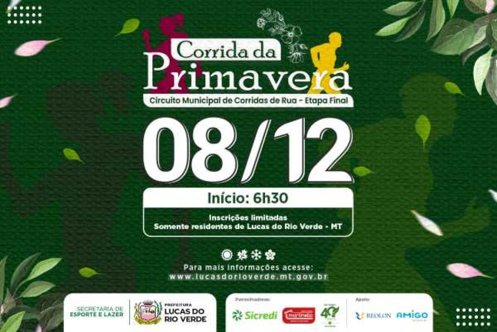 A partir desta quarta-feira (13), ao meio-dia, estarão abertas as inscrições para a quarta e última etapa do Circuito Municipal de Corridas de Rua de Lucas do Rio Verde. Os atletas que desejam participar da Corrida da Primavera devem garantir a vaga no seguinte endereço eletrônico: agitoesportes.com.br