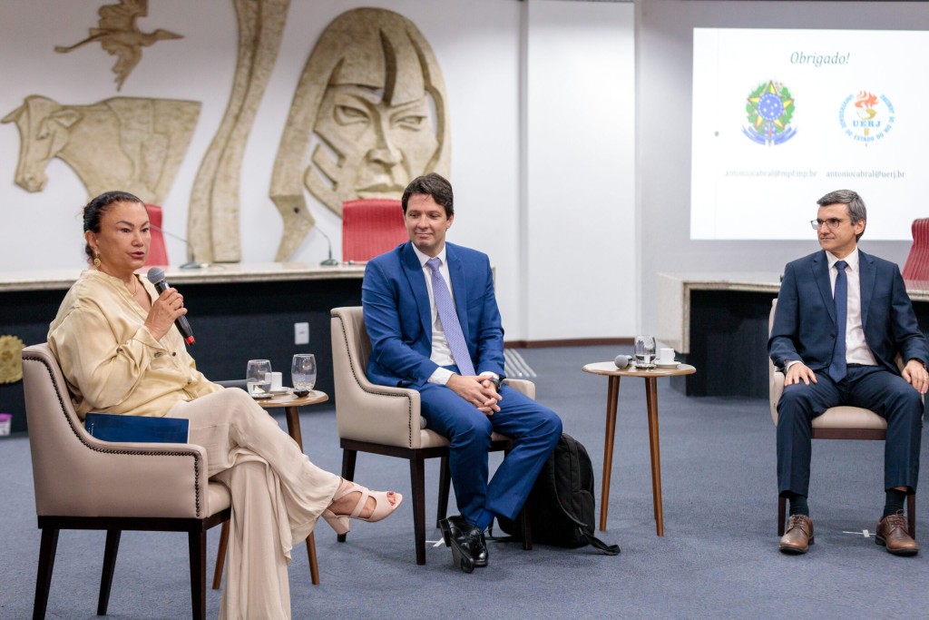 #Paratodosverem. Esta matéria possui recursos de texto alternativo para promover a inclusão das pessoas com deficiência visual. Foto 1: Foto em plano aberto que mostra a desembargadora Antônia Siqueira, o procurador da República Antonio do Passo Cabral e o juiz do trabalho Ivan José Tessaro sentados em poltronas, no Plenário do TRT 23. A desembargadora fala ao microfone. Ela é uma senhora de pele clara, cabelos castanhos presos, olhos castanhos, usando calça, sandália e camisa em tons sépia de bege. Foto 2: Foto colorida que mostra o desembargador Rodrigo Curvo sentado em uma poltrona e falando ao microfone no Plenário do TRT 23. Ele é um homem branco, alto, de cabelos e olhos escuros, usando camisa clara, gravata cinza clara, terno azul escuro. Atrás dele há um telão com a logo do evento, nas cores azul e amarelo.