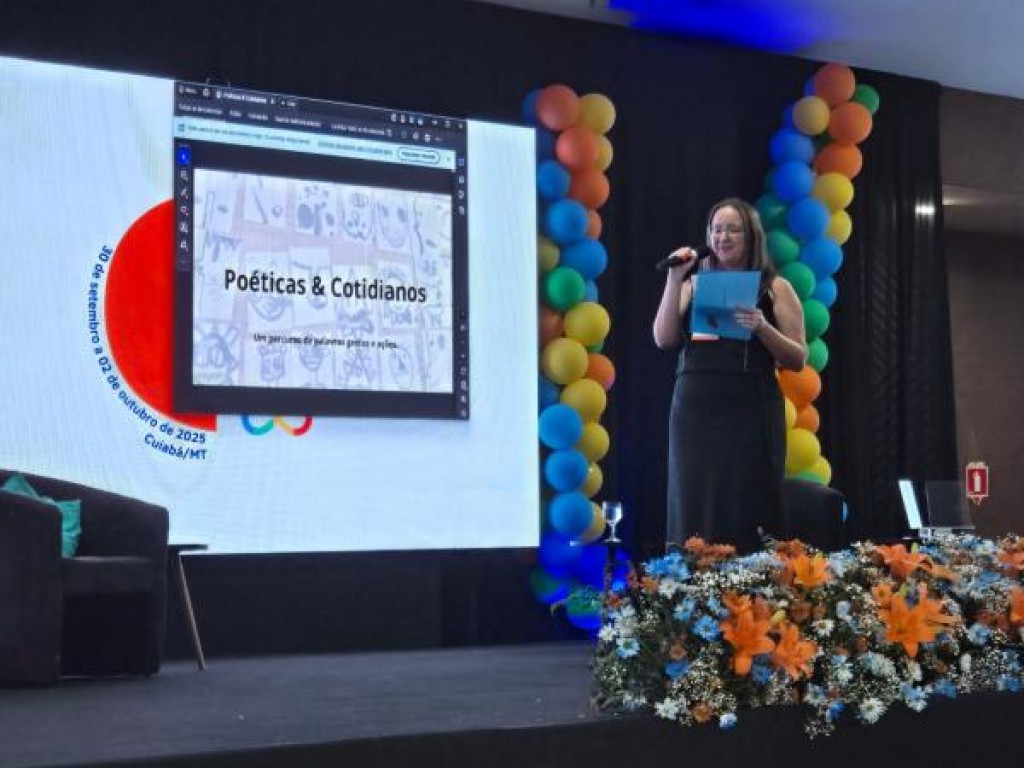 A secretária de Educação de Sorriso, Adriana Reichert Palú, foi a mediadora, nesta quinta-feira (2 de outubro), da palestra Poéticas visuais / A Poesia dos Dias, do poeta, palhaço, músico, artista e “escrevedor” das infâncias, Guga Cidral.