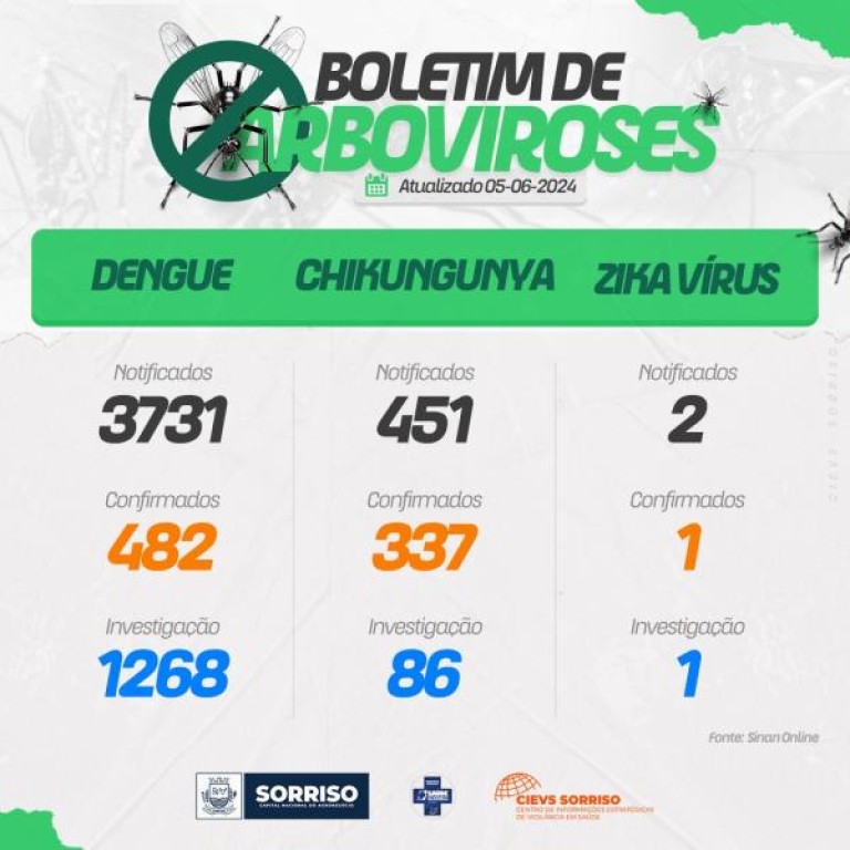 A Secretaria de Saúde divulgou nesta manhã, 05 de junho, o boletim 07/2024 com dados da dengue, Chikungunya e Zika vírus. E infelizmente os números continuam em ascensão. No novo boletim, constam 482 confirmações para dengue – 76 a mais do que no dia 21 de maio, data do boletim 06/2024; 337 para Chikungunya – 132 casos a mais que no boletim anterior; e um caso de Zika.