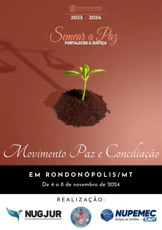 Esta matéria possui recursos de texto alternativo para promover a inclusão das pessoas com deficiência visual. Descrição de imagem: arte gráfica digital vertical com a logo da gestão, fundo terracota e uma planta germinando na terra. Ao centro, o nome do evento “Movimento Paz e Conciliação”, acima, a logo Semear a Paz, Fortalecer a Justiça 2023|2024. Uma faixa preta escrito “em Rondonópolis/MT De 4 a 8 de novembro de 2024. Realização: Nugjur, Cejusc e Nupemec.