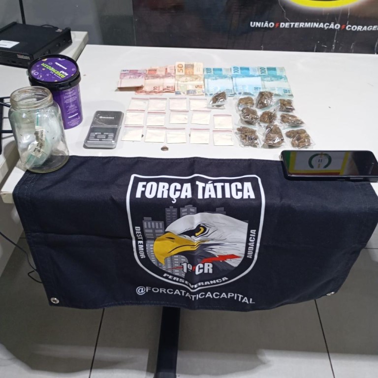 Policiais militares da Força Tática do 1º Comando Regional prenderam um homem, de 25 anos, por tráfico ilícito de drogas, nesta terça-feira (18.11), em Várzea Grande. Com o suspeito, foram apreendidas dez porções de maconha e 14 porções de cocaína, e uma quantia de R$375,00 em dinheiro.
