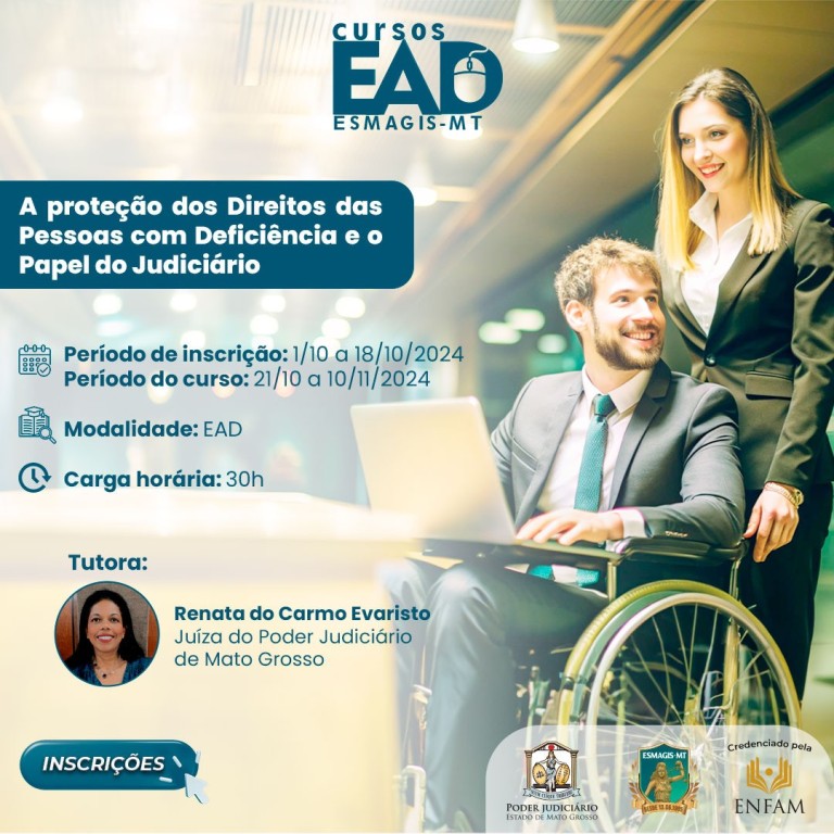 Já estão abertas as inscrições para o curso “A proteção dos Direitos das Pessoas com Deficiência e o Papel do Judiciário”, disponibilizado pela Escola Superior da Magistratura de Mato Grosso (Esmagis-MT) e voltado a magistrados, magistradas, assessores e assessoras do Poder Judiciário Estadual.O prazo de inscrição segue até o dia 18 de outubro, sendo que as aulas, na modalidade Ensino à Distância (EAD), serão ofertadas de 21 de outubro a 10 de novembro (30 horas/aula). Ao todo, foram disponibilizadas 40 vagas para o curso de formação continuada, que é válido para fins de vitaliciamento e/ou promoção de magistrados.