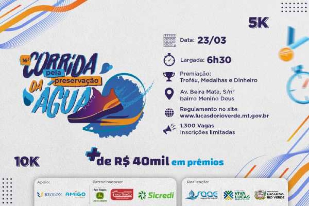 A Corrida Pela Preservação da Água está marcada para o dia 23 de março, às 6h30, com largada e chegada na Avenida Beira Mata. Haverá duas opções para o corredor luverdense se inscrever, sendo dez quilômetros (500 vagas) e a outra para atletas de cinco quilômetros (800 inscrições).
