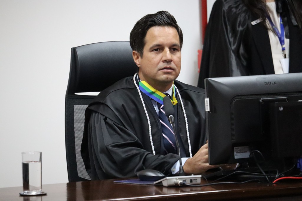 #PraTodosVerem: Foto que mostra o juiz designado ao cargo de ouvidor eleitoral, vestindo uma toga preta e uma gravata azul com listras rosa claro, com os cabelos pretos penteados para trás. Ele está sentado, com as mãos apoiadas em uma bancada do Plenário, que tem a tela de um computador, um microfone de mesa e um copo de água.
