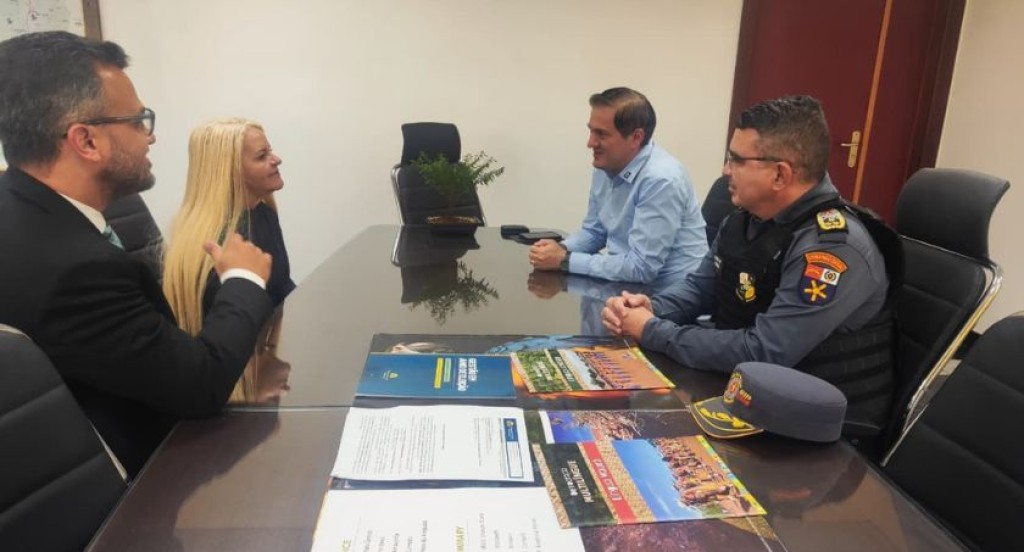 #PraTodosVerem: A imagem mostra quatro pessoas sentadas em uma mesa de reunião. Duas delas estão de terno, uma mulher e um homem, enquanto do outro lado há um homem de camisa social e um policial fardado. Eles conversam em ambiente formal, com documentos e folders sobre a mesa.