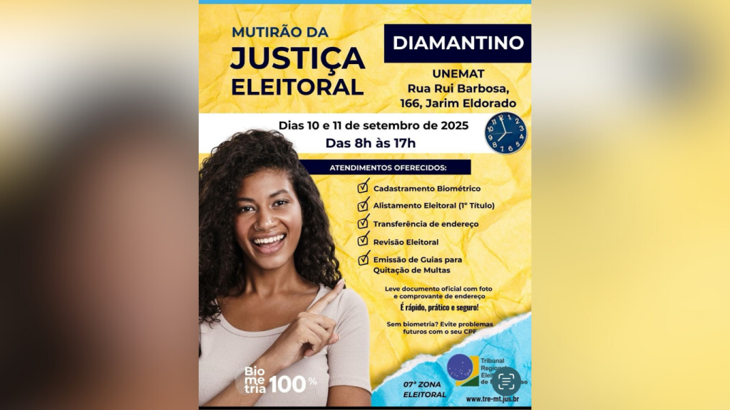 A Justiça Eleitoral, por meio do Tribunal Regional Eleitoral de Mato Grosso (TRE-MT) e da 7ª Zona Eleitoral, em parceria com a Universidade do Estado de Mato Grosso – UNEMAT, Câmpus de Diamantino, convidam os eleitores de Diamantino, Alto Paraguai e Deciolândia para participar do “Mutirão da Justiça Eleitoral” que acontecerá nos dias 10 e 11 de setembro, das 8h às 17h, no auditório da UNEMAT em Diamantino.