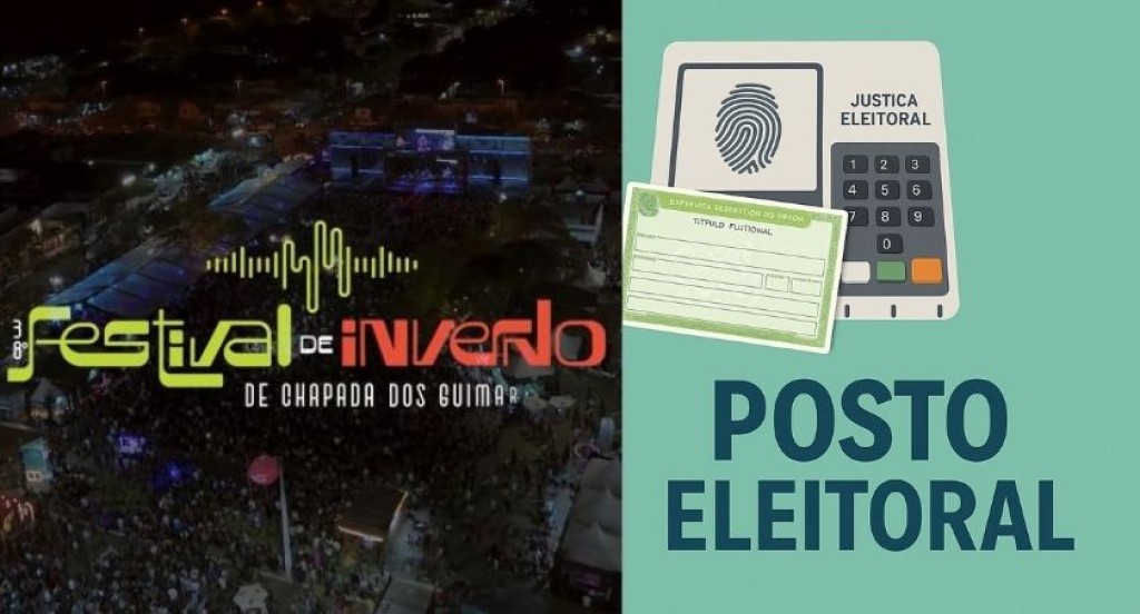 #DescriçãodaImagem: A imagem é dividida em duas partes. À esquerda, uma foto aérea noturna do Festival de Inverno de Chapada dos Guimarães, com palcos iluminados e uma multidão reunida. Sobre a imagem, está a logo oficial do evento. À direita, em fundo verde, aparecem uma urna eletrônica, um título de eleitor e a inscrição “Posto Eleitoral”, representando a presença da Justiça Eleitoral no festival.