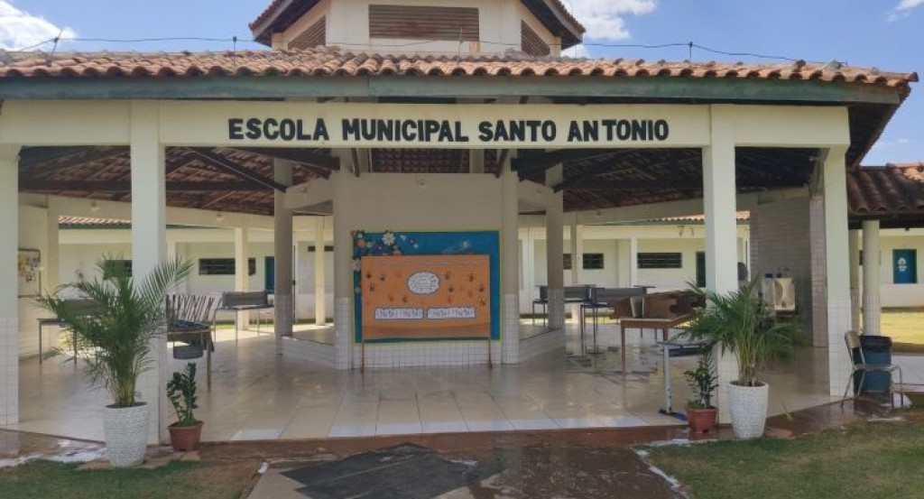 #PraTodosVerem: A imagem mostra o pátio da Escola Municipal Santo Antônio. No centro, há uma estrutura com paredes que se elevam acima do telhado e um painel azul e laranja. O espaço é semiaberto, com alguns pilares de sustentação, e quatro plantas em vasos decoram a frente da estrutura.