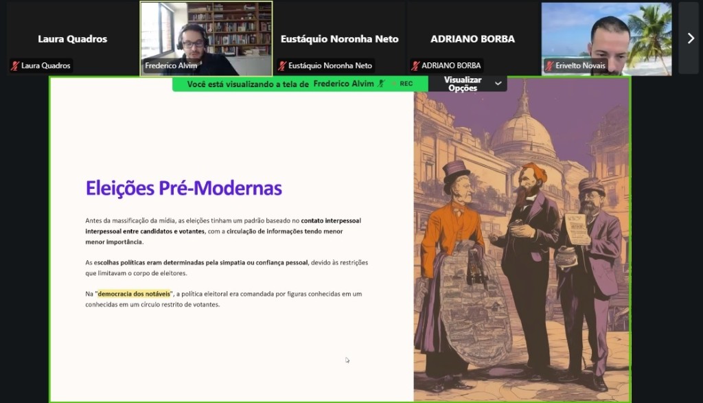 #PraTodosVerem: Foto da sala de aula online com alguns participantes e do professor na parte superior, e na parte central da tela a apresentação de slides do conteúdo da aula explicando sobre as eleições pré-modernas e seus conceitos.