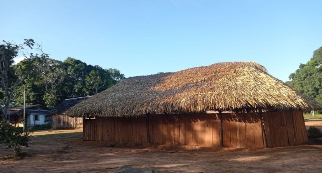 #PraTodosVerem: A imagem mostra uma construção rústica de madeira com cobertura de palha, típica de comunidades tradicionais ou indígenas. Neste caso, é da Aldeia Pé de Mutum. O chão é de terra batida e, ao fundo, é possível ver outras casas simples, além de árvores que compõem uma vegetação densa. O cenário transmite simplicidade, contato direto com a natureza e aspectos culturais da vida comunitária.