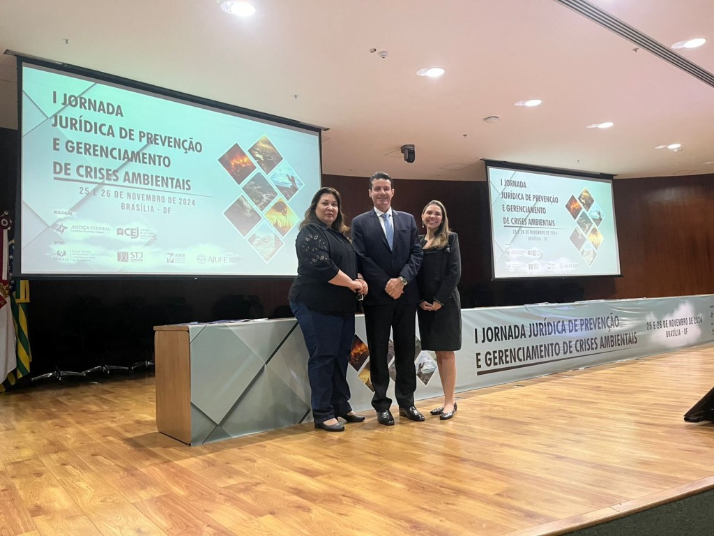 Descrição da foto: fotografia colorida e horizontal. Imagem de três pessoas em pé, uma ao lado da outra. Duas mulheres, usam roupa preta e o homem usa terno preto, camisa branca e gravata azul. Ao fundo painéis com o texto: I Jornada Jurídica de Prevenção e Gerenciamento de Crises Ambientais.