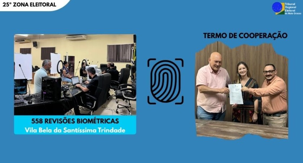 #PraTodosVerem: A imagem divulga ações da 25ª Zona Eleitoral em Vila Bela da Santíssima Trindade, destacando a realização de 558 revisões biométricas. À esquerda, a foto mostra servidores atendendo eleitores em um espaço com equipamentos de coleta biométrica. À direita, outra imagem registra a assinatura de um termo de cooperação entre três pessoas, em clima de formalidade e parceria institucional. No centro, tem um ícone de digital simboliza a biometria e, no canto direito superior, está a marca do TRE-MT.