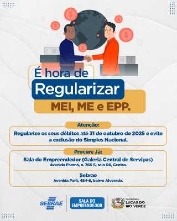 O prazo final para regularização é o dia 31 de outubro e os interessados devem procurar a Sala do Empreendedor, localizada na Avenida Paraná, na Galeria Central de Serviços, bairro Centro ou o Sebrae, localizado na avenida Pará n° 484, bairro Alvorada, para regularizar sua situação e permanecer no regime tributário do Simples Nacional.