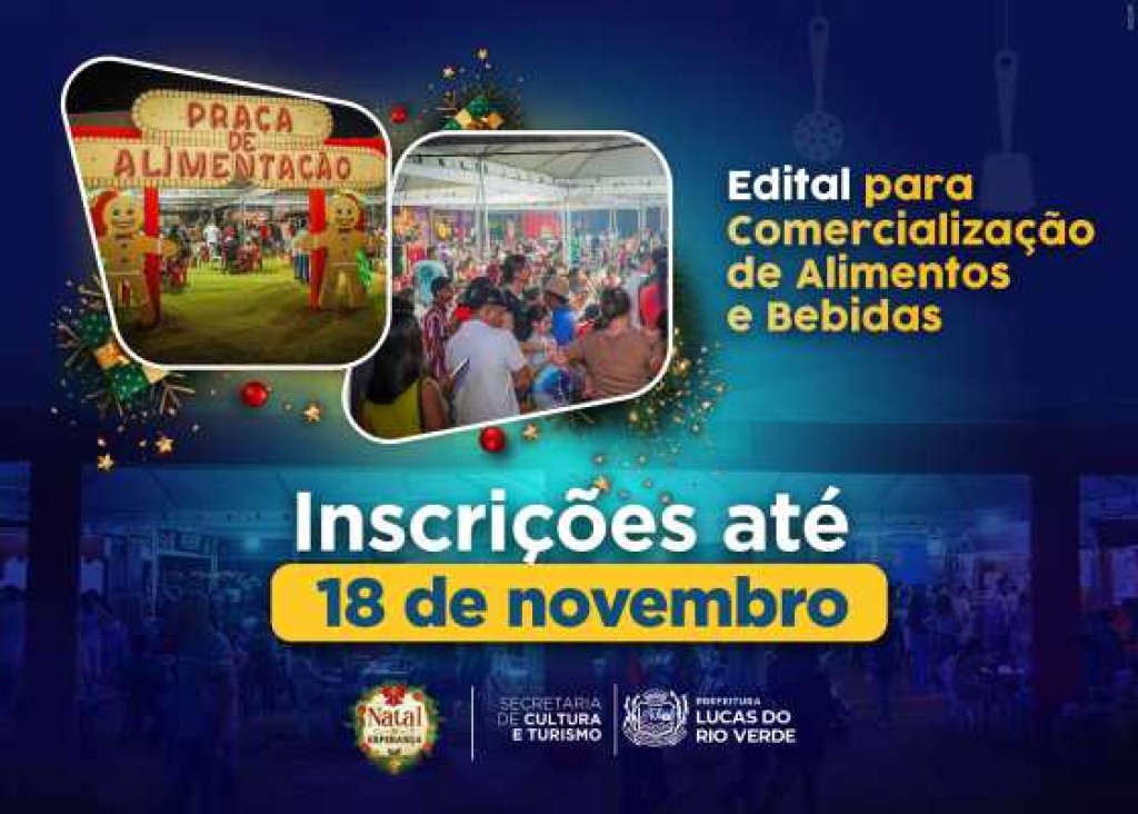 A partir desta sexta-feira (01), a Prefeitura de Lucas do Rio Verde, por meio da Secretaria de Cultura e Turismo, está com as inscrições abertas, do Edital de Seleção Nº 001/2024/SMCT, para seleção de empresas interessadas em comercializar alimentos e bebidas na praça de alimentação do “Natal da Esperança 2024”.