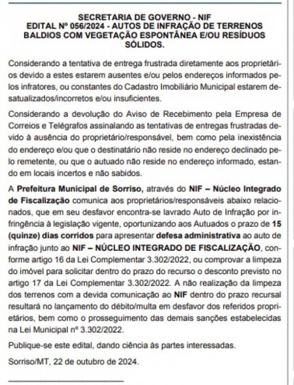 Por meio do edital 056/2024, publicado no site oficial, bem como na edição desta quarta-feira (23 de outubro) do Diário Oficial da Associação Mato-grossense dos Municípios (AMM), a Prefeitura de Sorriso divulgou uma nova lista de proprietários de terrenos sujos autuados pelo Núcleo Integrado de Fiscalização (NIF).