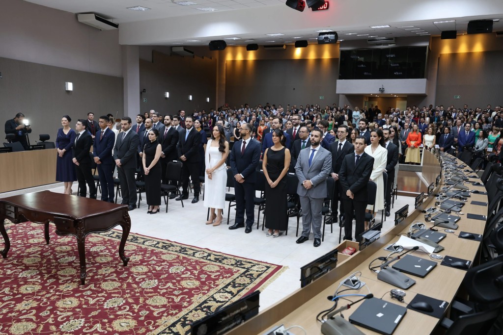Foto de uma cerimônia de posse em um auditório. Em destaque, um grupo de novos juízes e juízas, homens de terno e mulheres de vestido, está de pé e perfilado. Ao fundo, uma plateia lotada. No primeiro plano, uma mesa de madeira e bancadas técnicas.A população mato-grossense passa a contar com 35 novos (as) juízes e juízas a partir da manhã desta quarta-feira (21), com a sessão solene de posse realizada no Tribunal de Justiça (TJMT) na presença de centenas de pessoas, entre autoridades, magistrados, familiares, servidores e visitantes. Com os novos integrantes, o Judiciário estadual cumpre seu dever de garantir a presença de ao menos um magistrado em cada comarca do interior.