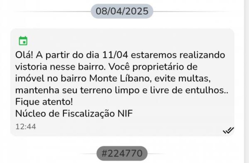 Com base nos dados disponibilizados no cadastro do imóvel, o NIF envia uma mensagem, via WhatsApp, avisando da inspeção. O número que envia a mensagem é o mesmo que pode ser acessado para falar com o NIF: 66 99927 2611.