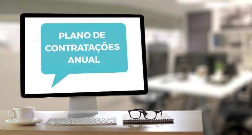 #PraTodosVerem: A imagem mostra um computador de mesa em um ambiente de escritório. Na tela, aparece um balão azul com o texto em branco: “PLANO DE CONTRATAÇÕES ANUAL”. Sobre a mesa estão uma xícara branca, um teclado, um caderno com óculos em cima e, ao fundo, vê-se um ambiente desfocado com móveis de escritório.