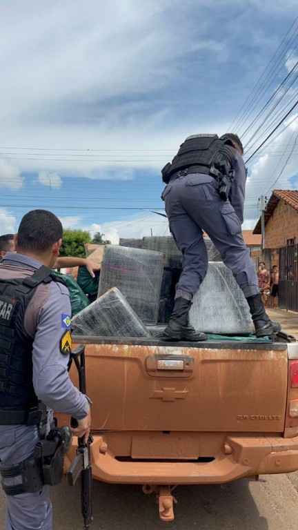 Imediatamente, os policiais militares se deslocaram ao endereço informado e flagraram a caminhonete estacionada na frente de uma residência, com dois homens fazendo o descarregamento de um material.