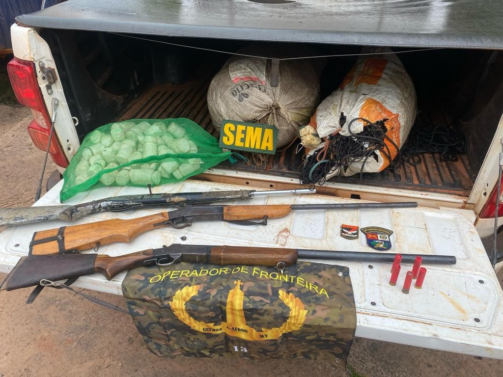 Na área, os policiais flagraram 268 lascas e toras de madeira extraídas irregularmente, sem documentação. Os policiais encontraram também diversos apetrechos de pescas como redes, 43 boias de isopor e um arpão.