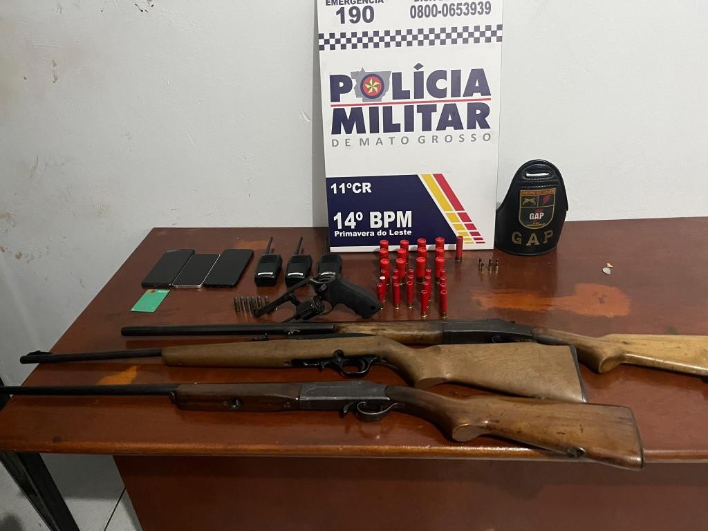 Policiais militares do 14° Batalhão prenderam três homens, com idades entre 33 e 47 anos, por porte ilegal de arma de fogo, na noite desta sexta-feira (12.9), em Primavera do Leste. Com os suspeitos, foram apreendidos um revólver, três espingardas e 47 munições de diversos calibres.