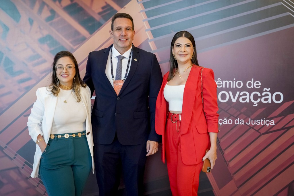 #Paratodosverem – Esta matéria possui recursos de texto alternativo para promover a inclusão das pessoas com deficiência visual. Descrição da imagem: desembargador Luiz Octávio Saboia, ladeado pela assessora de Inovação, Eduarda Perdigão, e pela chefe de gabinete Helen Graciosa. Eles estão em frente a um painel com a logomarca do Prêmio de Inovação da Justiça. Eles estão sorrindo para a foto.