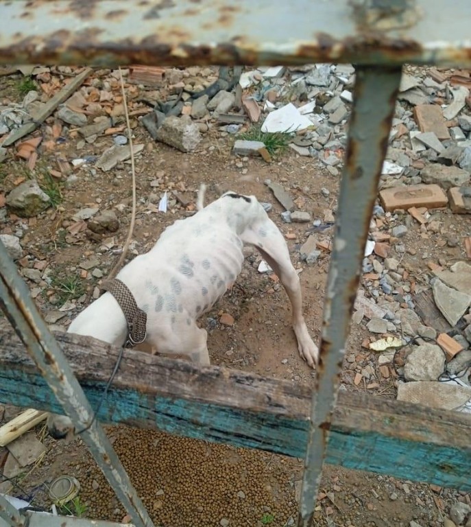 No local, os investigadores encontraram dois cachorros, sendo uma cadela de porte médio que estava amarrada em uma pequena corda, sem acesso à alimentação e água, apresentando estado de magreza extrema e infestação por parasitas.
