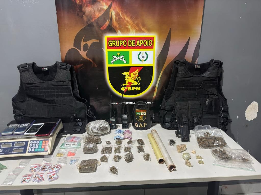 Com eles, foram localizadas um pedaço grande de maconha, além de duas porções menores e uma sacola contendo a droga, três porções de pasta base, seis porções de cocaína, dois coletes com placa balística, material para preparo e uma quantia de R$ 17 em dinheiro.