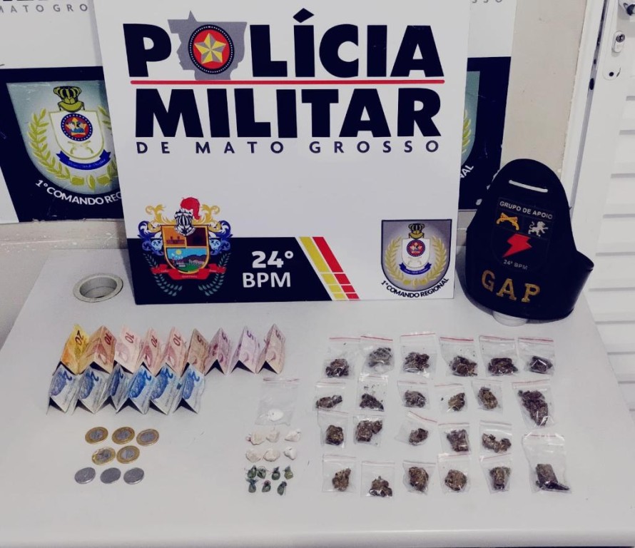 Policiais militares do 24º Batalhão prenderam um homem, de 23 anos, por tráfico ilícito de drogas, na noite desta terça-feira (27.1), em Cuiabá. Com o suspeito, foram apreendidas 45 porções de drogas entre maconha e pasta base, e uma quantia de R$99 em dinheiro.