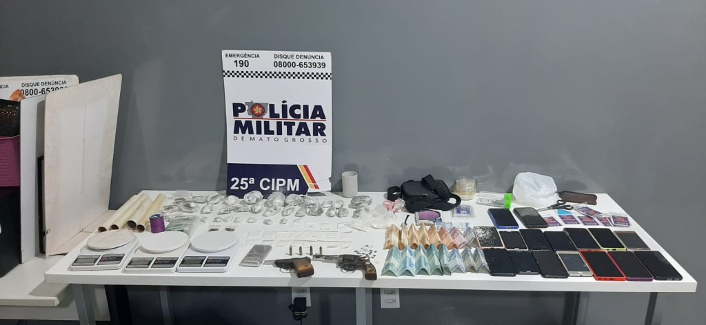 Policiais militares da 25ª Companhia Independente prenderam dois irmãos, de 19 e 22 anos, por tráfico ilícito de drogas e posse ilegal de arma de fogo, em Várzea Grande. A dupla foi presa durante uma festa, onde foram apreendidas 59 porções de maconha e cocaína que seriam comercializadas no evento e duas armas de fogo.