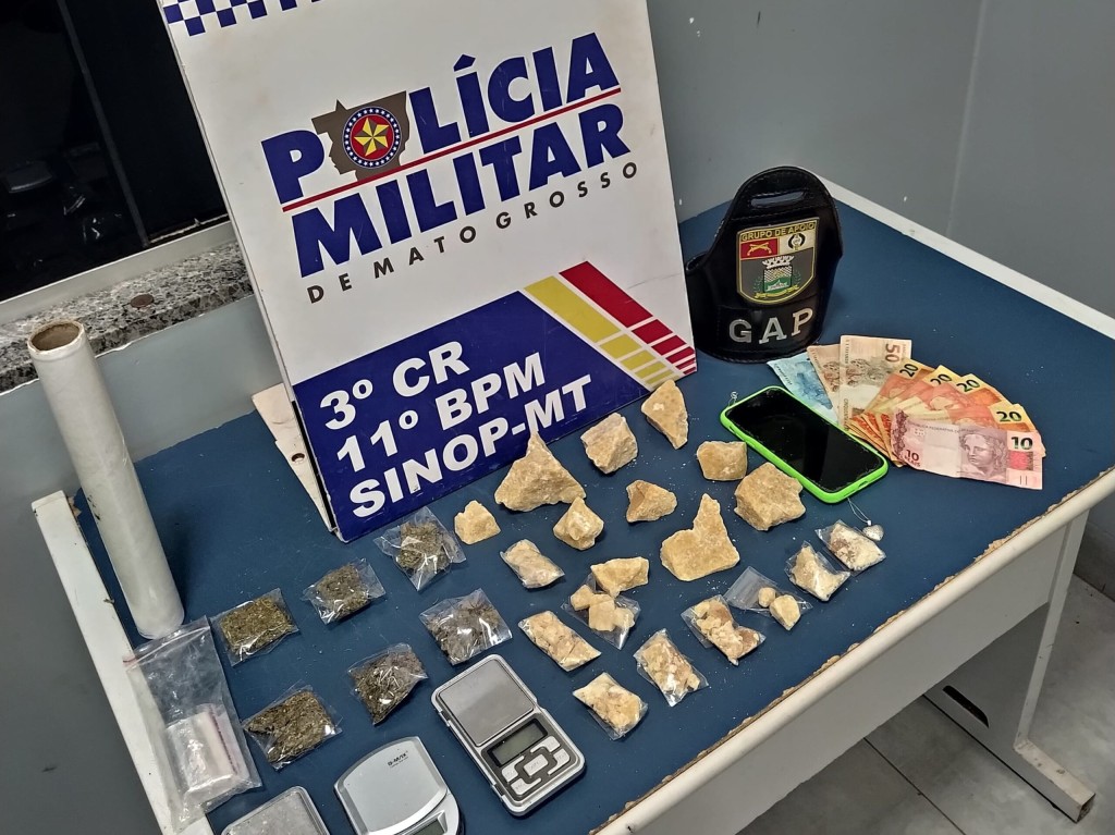 Durante a busca foram encontradas uma grande quantidade de entorpecentes, sendo 6 porções de maconha, 19 porções de pasta base, 3 balanças, 01 rolo plástico, vários invólucros e um celular. A suspeita foi conduzida à delegacia junto dos materiais apreendidos para registro do boletim de ocorrência.