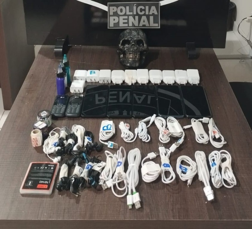 Além dos sete aparelhos de celulares, também foram apreendidos 11 carregadores completos, nove fones de ouvido, uma bateria de celular, uma placa telefônica, além de três frascos de tinta para tatuagem e dois trituradores de tabaco.