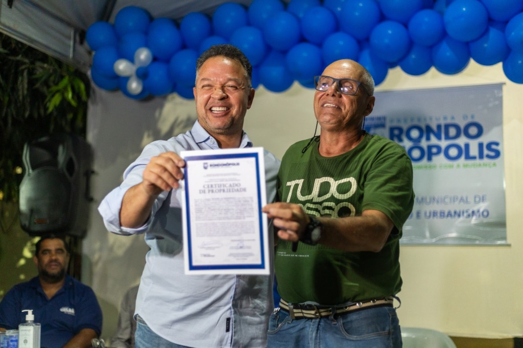 O prefeito de Rondonópolis, Cláudio Ferreira, juntamente com o secretário municipal de Habitação e Urbanismo, Jaime Cícero Amador Ferreira, participaram na noite desta quinta-feira (17/7) da entrega de 48 títulos definitivos de propriedade para os moradores da Vila Poroxo.