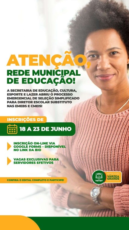 A prefeitura de Várzea Grande, por meio da Secretaria Municipal de Educação, Cultura, Esporte e Lazer (SMECEL), lançou o Processo de Seleção Simplificado para diretor escolar substituto nas Escolas Municipais de Educação Básica (EMEBs) e Centro Municipal de Educação Infantil (CMEIs).