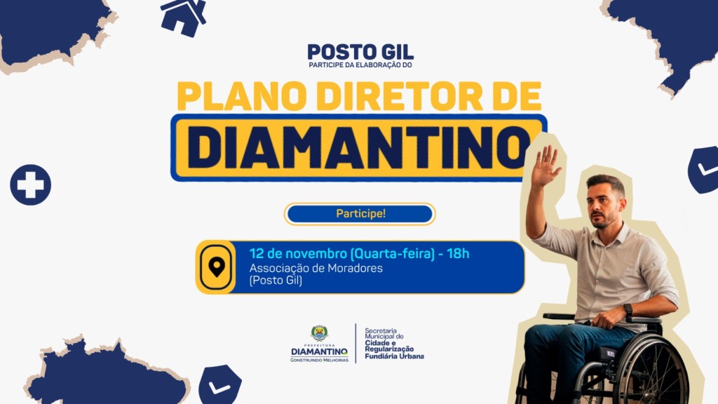 A Prefeitura de Diamantino, por meio da Secretaria de Cidade e Regularização Fundiária, convida toda a comunidade da região do Posto Gil para participar da reunião pública de elaboração do Plano Diretor de Diamantino, que será realizada no dia 12 de novembro (quarta-feira), às 18h, na Associação de Moradores da comunidade.