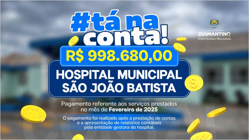 Na terça-feira (01.04), a Prefeitura de Diamantino efetuou o pagamento total de R$998.680,00 (novecentos e noventa e oito mil, seiscentos e oitenta reais) ao Instituto Primeiro, Organização Social responsável pela administração do Hospital Municipal São João Batista. O valor é proveniente de recursos próprios do município, além de repasses do Governo de Mato Grosso e do Governo Federal.