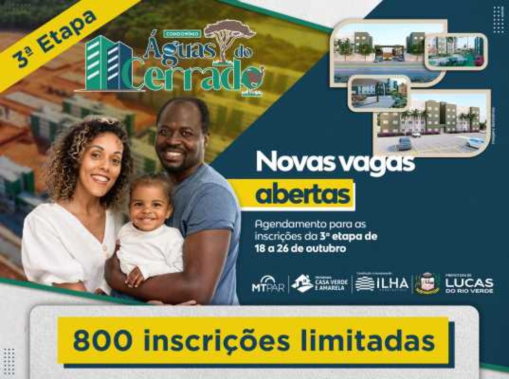 A Prefeitura de Lucas do Rio Verde, por meio da Secretaria Municipal de Assistência Social e Habitação, informa que estará aberto o período de agendamento para as inscrições da terceira etapa do projeto habitacional Condomínio Águas do Cerrado, entre os dias 18 e 26 de outubro de 2025.