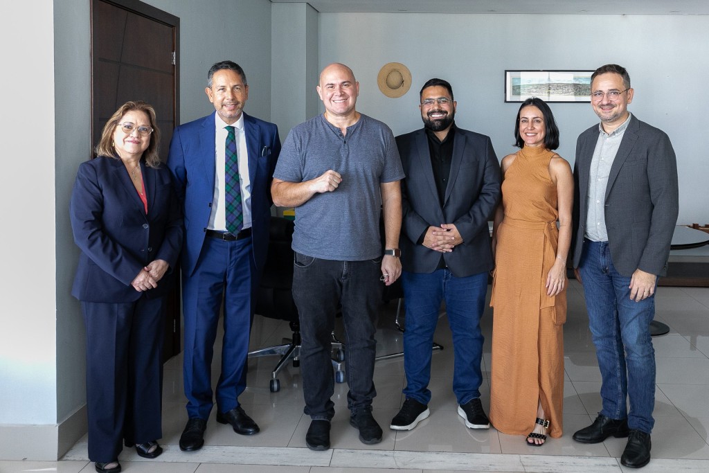 Na imagem principal o embaixador e a representante da nação vizinha posam ao lado do secretario de turismo de Cuiabá em uma foto no terraço da Prefeitura de Cuiabá.