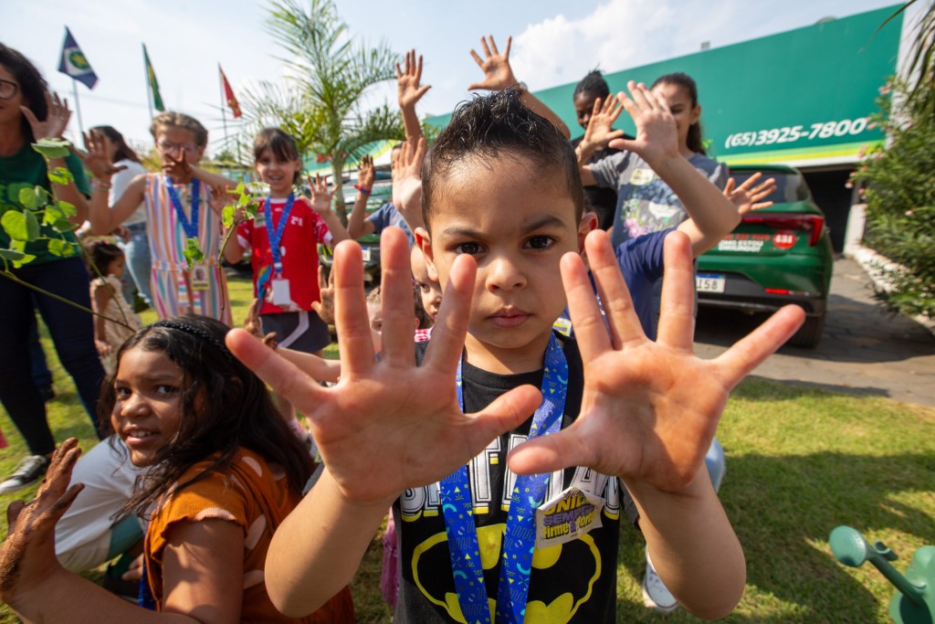 #Paratodosverem. Esta matéria possui recursos de texto alternativo para promover a inclusão das pessoas com deficiência visual. Primeira imagem: fotografia colorida mostrando uma criança com as mãos esplamadas. Ao fundo outas crianças repetem o gesto. Segunda imagem: fotografia colorida registrando as crianças sentadas e assistido a uma apresentação, com projeção de slaides em um telão. Terceira imagem: fotografia colorida mostra o momento em que um grupo de crianças se aglomera emtorno de uma muda que está sendo plantada.