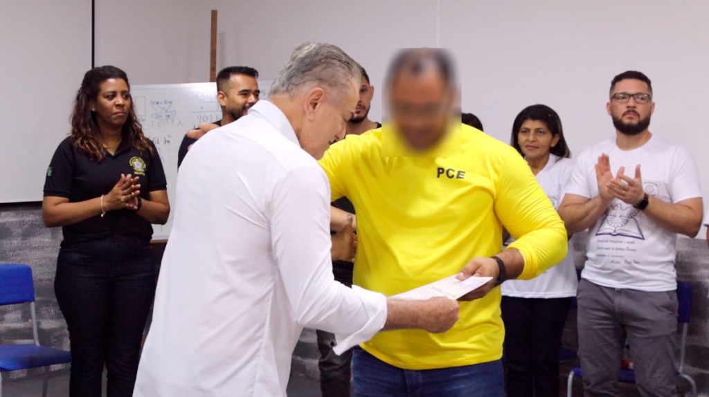 #ParaTodosVerem – Esta matéria possui recursos de texto alternativo para promover a inclusão das pessoas com deficiência visual. Imagem 1: Fotografia colorida, em primeiro plano o desembargador Orlando Perri entrega um certificado a um recuperando. O desembargador usa uma camisa de manga longa branca, olha em direção ao certificado e cumprimenta o recuperando com um tapinha nas costas. O recuperando retribui o cumprimento, veste uma camisa de malha de manga longa amarela com “PCE” escrito na parte superior direita. Ao fundo, diversas pessoas batem palma.