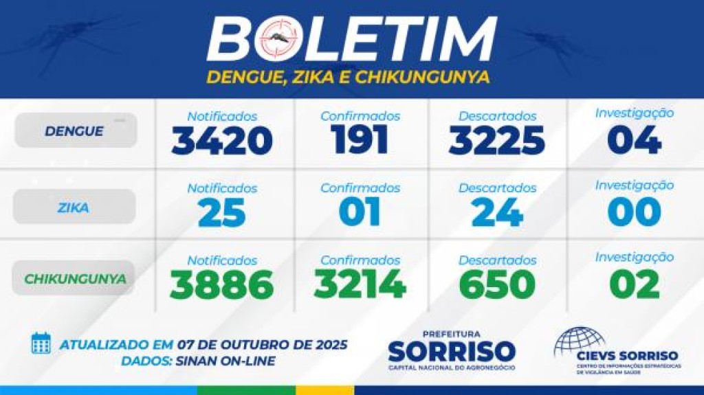 Hoje os bairros com maior número de registros de chikungunya estão o Vila Bela com 255; São José com 159; Nova Aliança I com 146 registros; Jardim Amazônia com 142 e Novos Campos com 132 situações positivas. O antigo distrito de Boa Esperança e atual município vizinho de Boa Esperança contabilizou 374 registros – vale lembrar que no Ministério da Saúde, Boa Esperança ainda consta veiculado à Sorriso. Já em relação à dengue são 13 casos no Rota e 12 no Jardim Amazônia. O caso de zika foi registrado no bairro União.