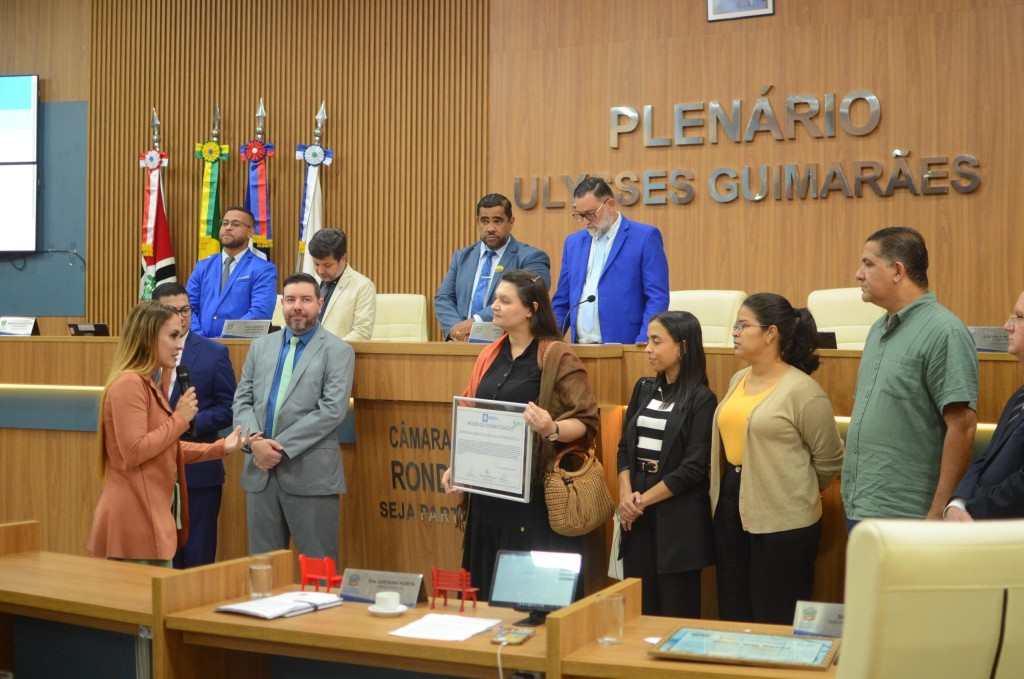 Acompanhada dos integrantes do quadro funcional da Secretaria – que representaram todos os servidores – Nair Ribeiro, Camila Zenzele Pinho e Jeth Wilson Figueiredo, Eryka compôs a mesa do plenário da Câmara de Vereadores para receber a distinção. Ofertando um serviço realizado com primor, a Cultura e Juventude vem dando orgulho ao Município de Rondonópolis e contentamento ao cidadão rondonopolitano.