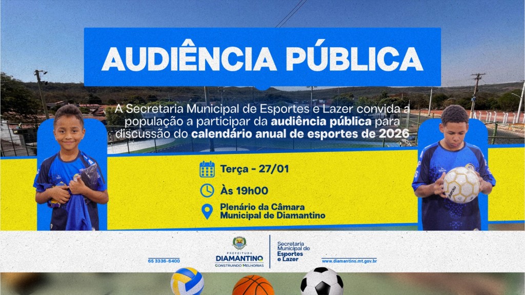 A Prefeitura de Diamantino, por meio da Secretaria Municipal de Esporte e Lazer, reforça o convite aos desportistas e à população em geral para participarem da Audiência Pública que será realizada na Câmara Municipal, no próximo dia 27 de janeiro, às 19h.