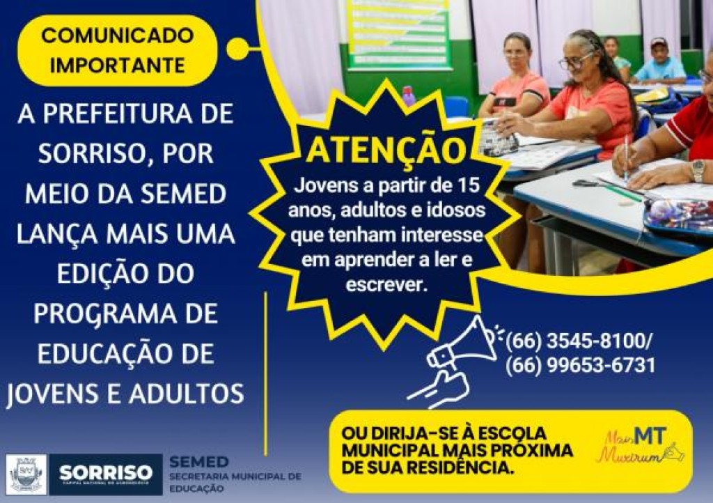 Conhece alguém com mais de 15 anos que ainda não sabe ler e escrever? Pode ser 15, 20, 25, 50, 75 ou até mais de 100 anos. Afinal, sempre é tempo de aprender, e, para garantir que todas as pessoas possam desfrutar da leitura, da escrita e de todas as possibilidades que elas oferecem, o Governo de Mato Grosso, em parceria com a Prefeitura de Sorriso, por meio da Secretaria Municipal de Educação, lançam mais uma edição do projeto Mais MT Muxirum, que está com as inscrições abertas durante todo o mês de junho. As aulas já iniciaram para algumas turmas já formadas e outras estão previstas para os dias 04 e 10 de junho.